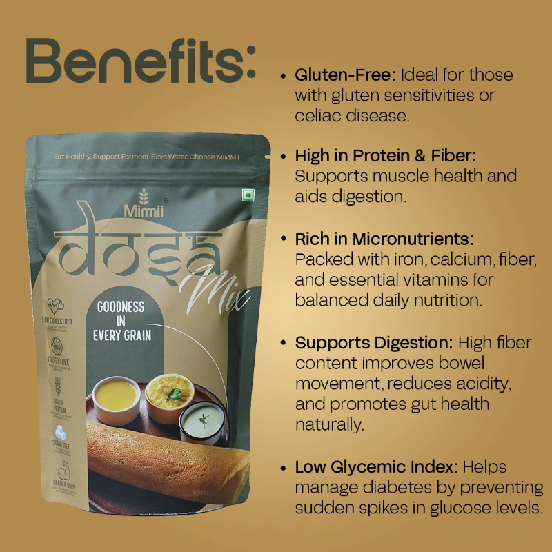 Give your meals a healthy upgrade with Mimmii’s Multi-Millet Dosa Mix — a perfect blend of traditional taste and modern nutrition. Made from a wholesome mix of millets, urad dal, methi, rice, and bengal gram, this dosa mix offers a gluten-free, fiber-rich, and protein-packed option for a nourishing breakfast or light dinner.